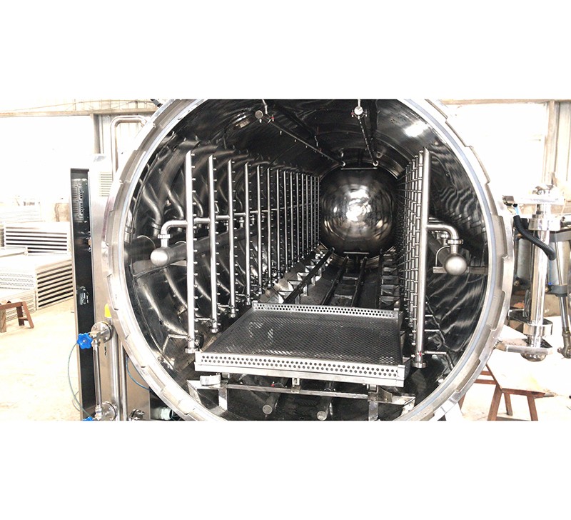 該設備由鍋體、鍋蓋、開啟裝置、鎖緊模塊、安全聯鎖裝置、軌道、滅菌框、蒸汽噴管及若干管口等組成、鍋蓋密封采用充氣式硅膠耐溫密封圈,密封可靠,使用壽命長。具有受熱面積大,熱效率高、加熱均勻、液料沸騰時間短、加熱溫度容易控制等特點、殺菌鍋主要用于食品行業、醫藥等各領域。